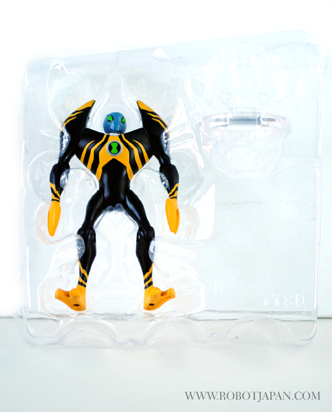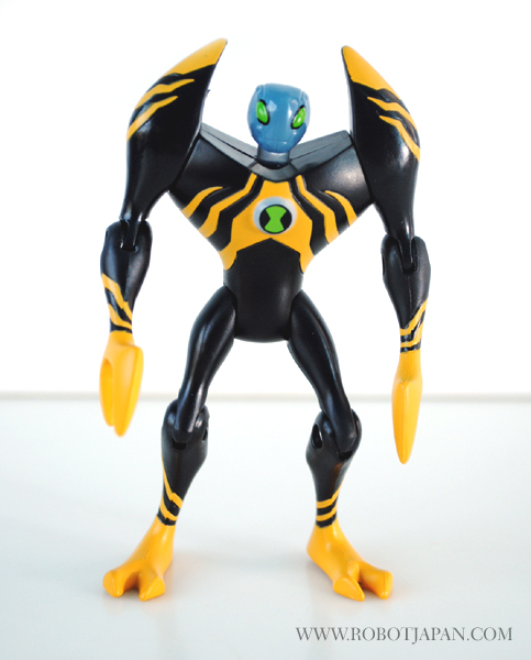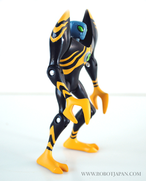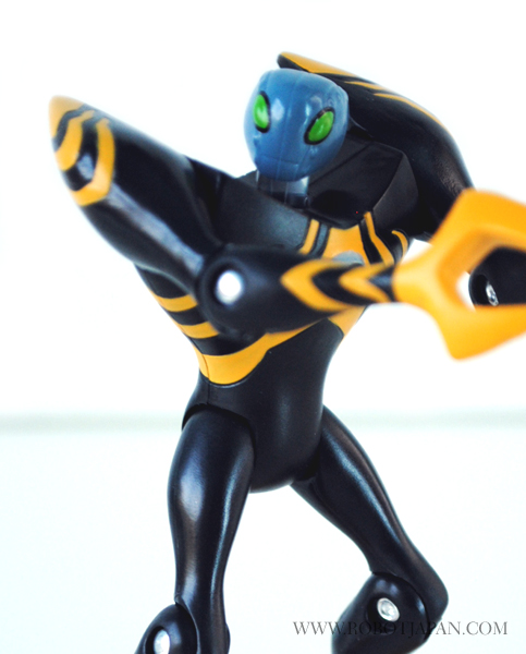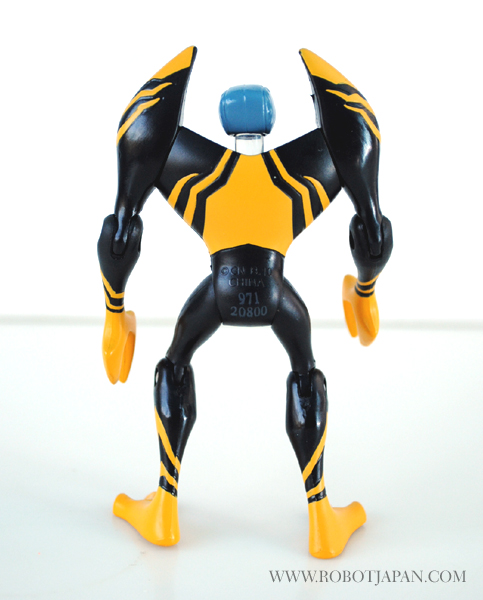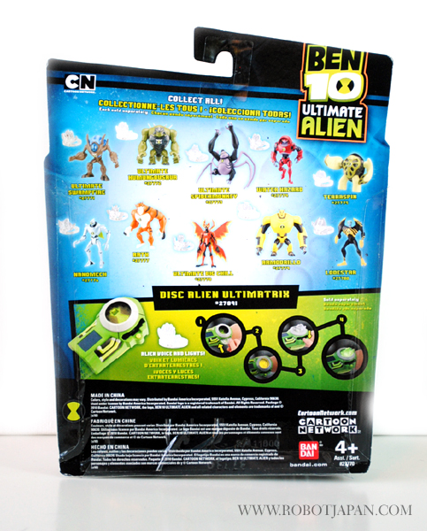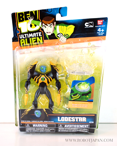 This little guy stands an approximately 4″ in height and totes a sleek and eye catching paint scheme. The head sculpt has the typical “Alien” like characteristics with elongated eliptical eye shape with a head that rotates from side to side. Lodestar features joints located in the shoulder, elbow, hip, and knee areas for a fairly decent amount of poseability considering it’s small size. His hands are claws that are lobster-like designed to squeeze or crush opponents. He is very light being made of all plastic, but durable enough to withstand play. He comes with his “Alien Disc” which can later be inserted into the Disc Alien Ultimatrix that features lights and voice. Overall a pretty cool little toy, and for the price, you can’t beat it.