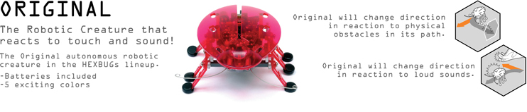 HEXBUG feels its way around sensing objects in its path and avoiding them. And it can even hear! You can control where it scurries through a hand clap, loud noise or table slap. The robotic bug will travel forward until it hits an obstacle or hears a loud noise. It will then backup in a half circle and then move forward in a different direction. HEXBUG comes in five distinct shapes and colors.