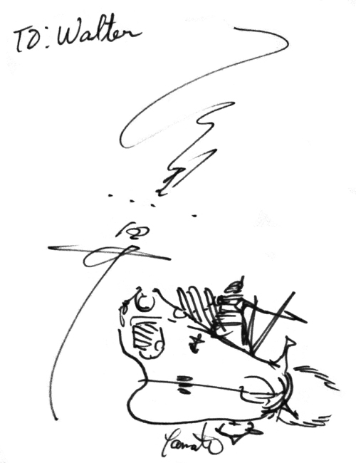 “Mr. Ishiguro had over the last decade and a half been a guest at a number of American anime conventions. I met him at what I believe to be his first American con appearance, Anime Expo 1995. The year before I had contributed a lengthy article to Antarctic Press’ Mangazine(issue 29), describing my impressions of (and largely guessed synopsis of) the second series of the science fiction anime Legend of the Galactic Heroes (which Ishiguro directed). Since Ishiguro had also directed the series that got me interested in anime in the first place, Space Battleship Yamato (in its American adaptation, Star Blazers), I was eager to speak to him and wanted to give him a copy of the Mangazine issue with my review in it. I managed to speak with him and his translator in a lobby annex of the convention space and after giving him the magazine, he took a moment to draw me a signed sketch of the Yamato.