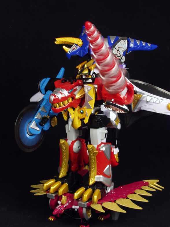 All of these zords (individual animals) can be combined with the Thundersaurus Megazord (sold separately) to make the Dino Rage Megazord. It sounds complex, but just imagine two big lego sets combining to make one toy. Pictured at the left is the combined two Megazords– Dino Rage Megazord.