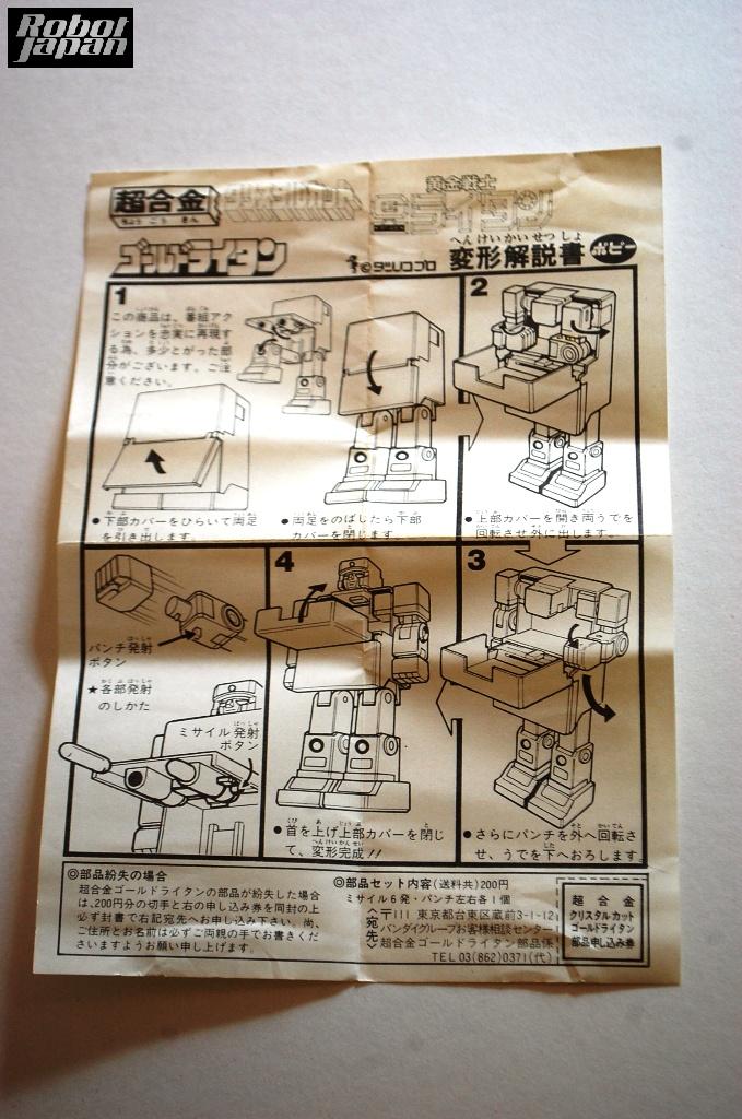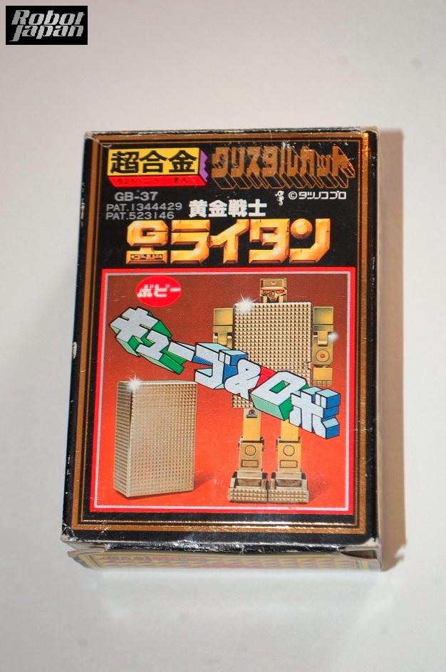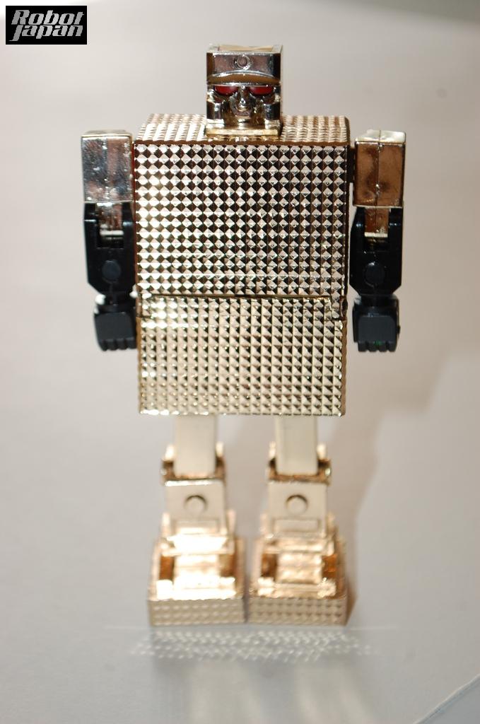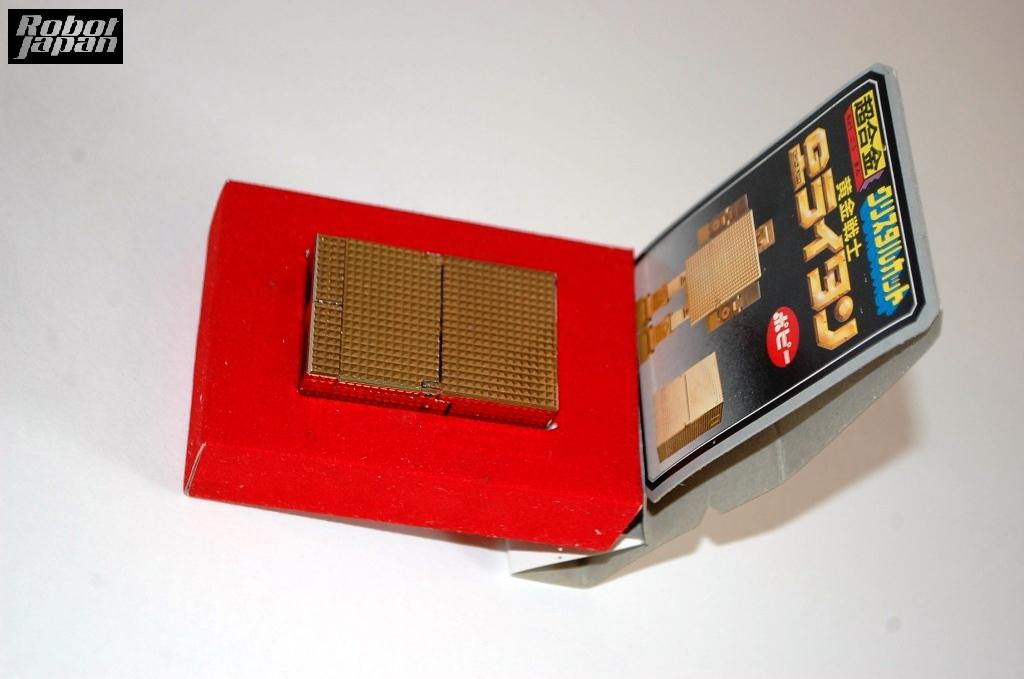 The toy itself is a nice, solid, bright gold brick. On the bottom are the Popy logo and markings in sticker form. These are often faded on used toys. The top front face of the toy flips down to reveal the arms and head folded into the body. The head rotates up, and the arms rotate out. It features firing fists.