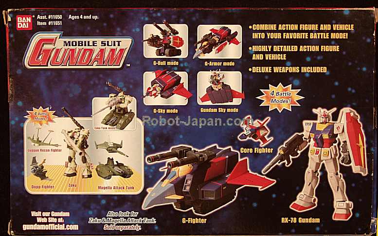 Below are pictures of the Bandai America playsets for RX-78 with the G-Bull, G-Armor, and G-Sky. Then there are pictuers of the Zaku and Magella tank set
