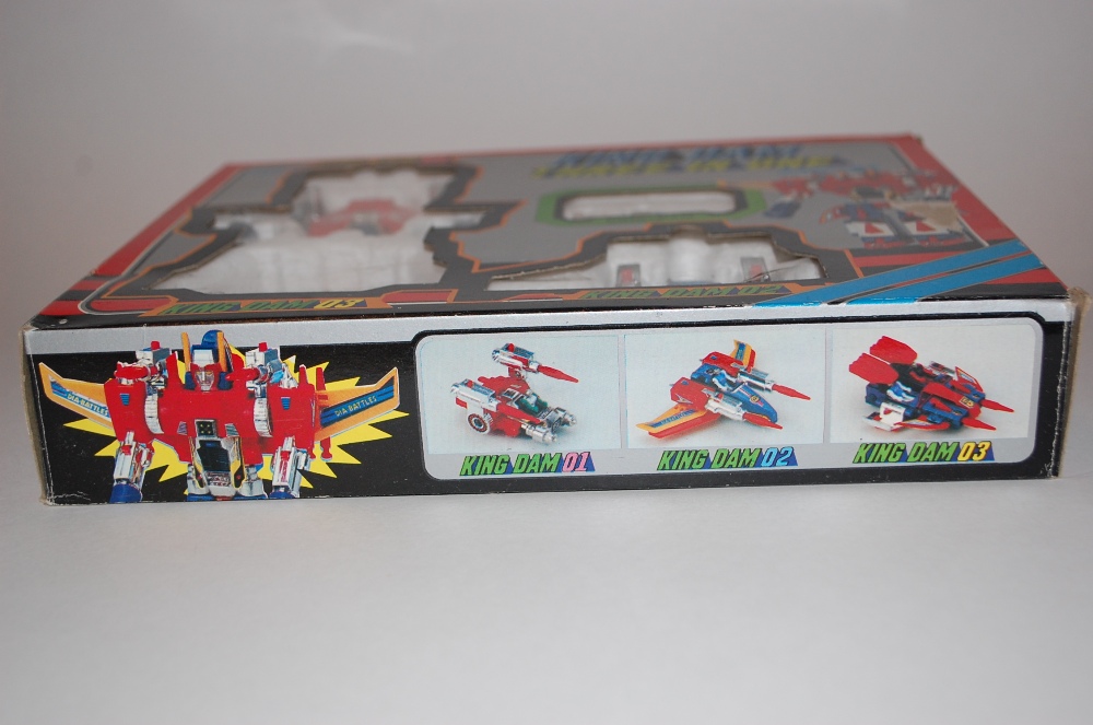 This is the King Dam knock-off of the Takara Diaclone Diabattles toy. Many KOs of this toy were manufactured, but this seems to be the most common one. The quality on this toy are fantastic, with ample diecast content. No manufacturing markings are present on the toy.