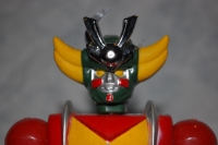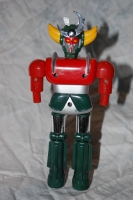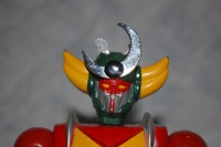 A truly crazy design. The body of Grendizer, and the basic head sculpt too (not the face, though). But then it adds the forehead design of Daitarn. And the head rotates to reveal a different face with a Zambot design. Note the crazy Frank LLoyd Wright-inspired leg stickers. Is this a model? I don’t think so, considering the chromed head emblems. Plus it has screws in the back: